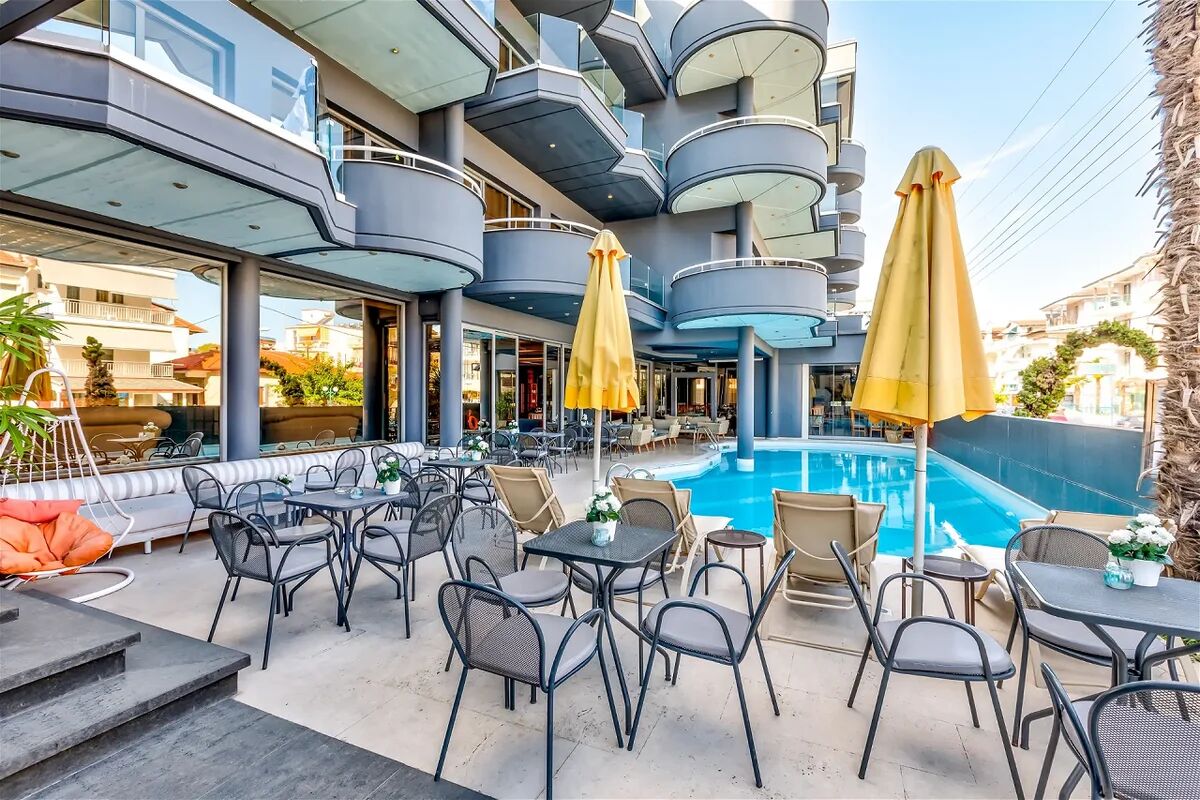 Położony jest w centrum tętniącej życiem miejscowości Paralia. Znajdują się tu liczne, sklepy, restauracje, bary.